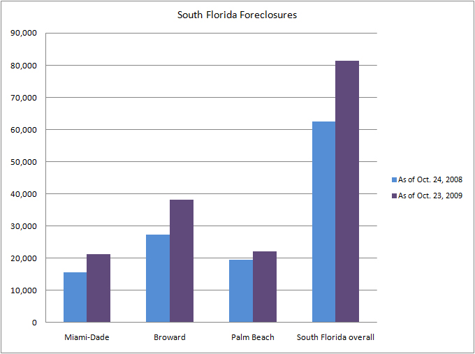 The number of foreclosures in South Florida year-to-date increased to 81,447 from 62,506 at the same point last year, according to data from Condo Vultures Realty. For this week alone, the number rose to 2,347 from 1,920 in the same week last year. The graph below shows foreclosure activity in South Florida’s three counties. TRD