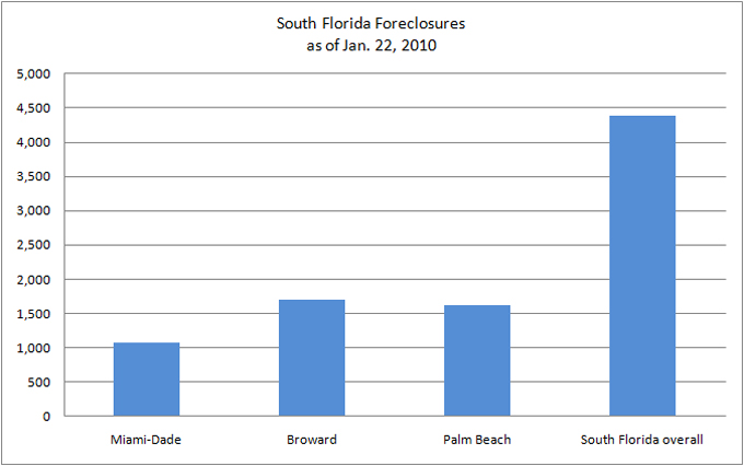 As of today, the number of foreclosures in South Florida year-to-date is 4,385, according to data from Condo Vultures Realty. For this week alone, there were 1,324 foreclosures in the tri-county region. The graph below shows foreclosure