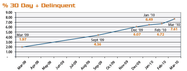 March ushered in a sharp rise in delinquencies on commercial real estate loans in commercial mortgage-backed securities, dashing hopes that February’s modest delinquency climb signaled the beginning of the end of the industry’s woes, according to a new report from analytics firm Trepp (see the full report below). The percentage of loans that were delinquent by 30 days or more jumped 89 basis points in March, which represents the highest month-over-month increase since the summer of 2009. That number was inflated by roughly 40 points because of the $3 billion loan on Manhattan’s massive Stuyvesant Town complex that is now in foreclosure, but even without the Stuyvesant Town loan, the delinquency rate rose by 0.49 percent in March, more than double the increase seen in February. TRD
