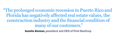 “The prolonged economic recession in Puerto Rico and Florida has negatively affected real estate values, the construction industry and the financial condition of many of our customers,” said Aurelio Aleman, president and CEO of First BanCorp, in a June 4 statement. “We are committed to continue to work expeditiously to resolve the items detailed in the agreements and execute our strategies to strengthen our balance sheet and return FirstBank to its full earnings potential.”