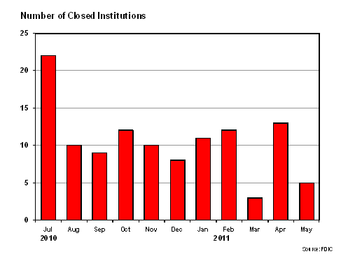 The number of U.S. national bank failures fell to five in May 2011 after a sharp jump to 13 in April but more closures are expected throughout 2011, according to a monthly bank failure report by