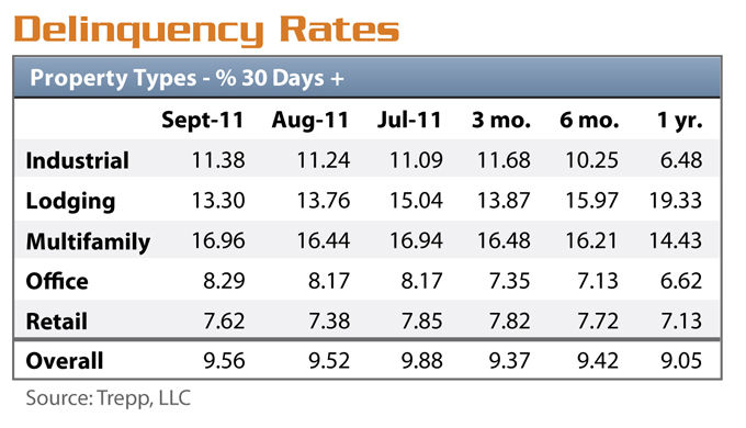 The number of commercial mortgage-backed securities delinquencies evened out in September nationwide, following a jump in July and a slide in August, data from market research firm Trepp, released today, shows. The delinquency rate for U.S. commercial real estate loans in CMBS inched up 4 basis points to 9.56 percent.